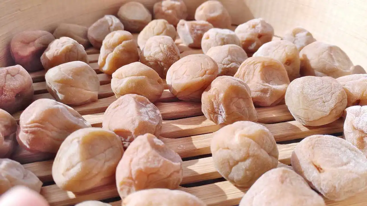 天日干しして乾燥した梅は食感が変わります。よりフルーティーなのは塩漬け直後の、干していない梅でしょう。それは梅の塩漬けです。皮にたくさん果肉が付いていて、それこそスモモみたいな状態を想像すると良いのではないかと思います。それが干すことで皮が薄くなり、あの梅干しの食感が生まれます。干さなくてもいい、だけど、干せば食感が良くなります。